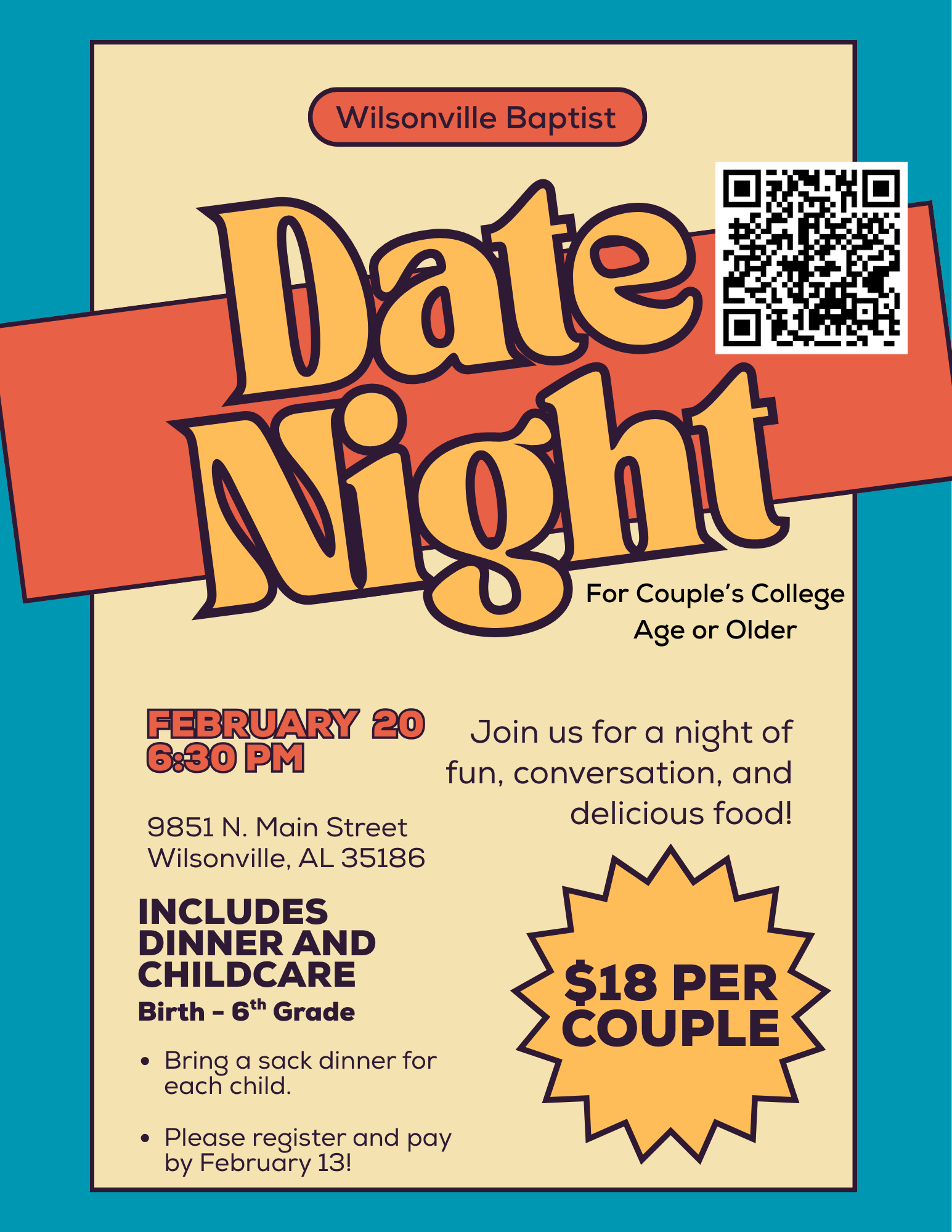 Reserve your spot and register for childcareHere! Please bring your child a sack supper. Childcare is provided for birth - 6th grade. Registration and payment deadline is February 13. You can pay onlinehere.